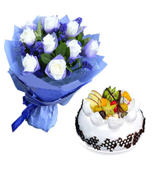 • 白玫瑰9枝單枝包裝,(勿忘我點(diǎn)綴),8寸水果鮮奶蛋糕