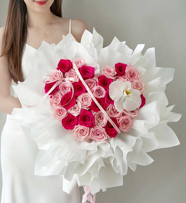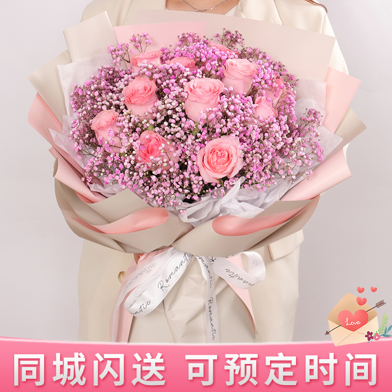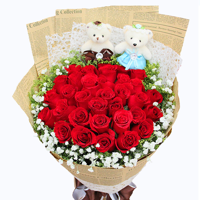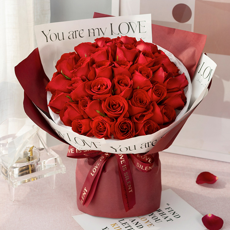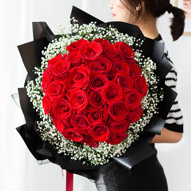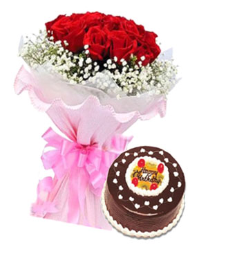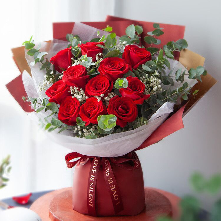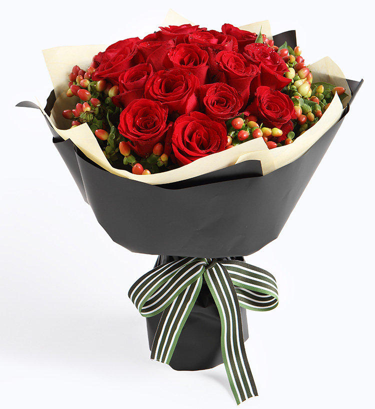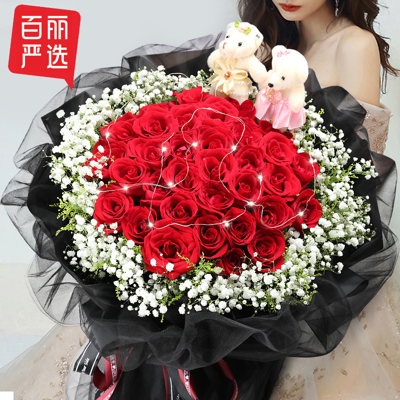 • 【11枝頂級(jí)紅玫瑰緊密居中,滿天星豐滿外圍】+【8寸巧克力蛋糕】