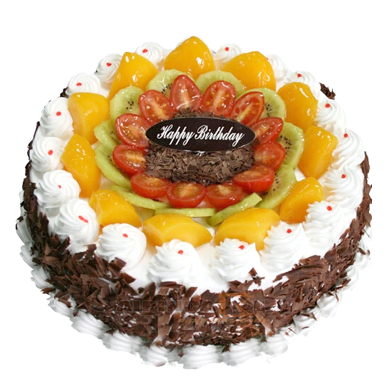 • 8寸鮮奶水果蛋糕,中心放各色時(shí)令水果,扇形巧克力插片