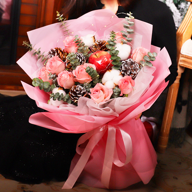 • 【19枝粉色扶郎,白色小菊間插,梔子葉間插】+【8寸鮮奶水果蛋糕】